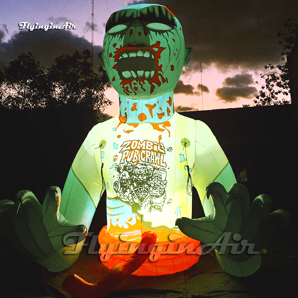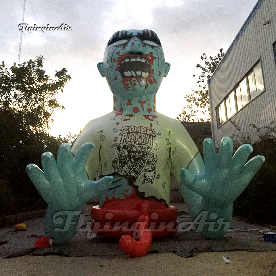 El zombi inflable gigante de la decoración de Halloween aterrador está hecho de tela de sarga, impermeable e ignífugo están disponibles. Los accesorios incluyen soplador, luz, cuerdas y sacos de arena. Si desea personalizar materiales, colores, tamaños, estilos y pinturas, contáctenos.